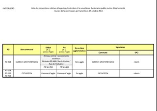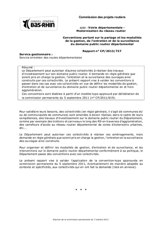 Le Département peut autoriser d'autres collectivités à réaliser des travaux d'investissement sur son domaine public routier. Il demande en règle générale que soient pris en charge la gestion, l'entretien et la surveillance des ouvrages ainsi construits par ces collectivités. Le présent rapport vise à valider les conventions à passer dans ces cas avec ces collectivités en vue de définir les modalités de gestion, d'entretien et de surveillance du domaine public routier départemental en et hors agglomération. Ces conventions sont établies à partir d'un modèle-type approuvé par délibération de la commission permanente du 5 septembre 2011 (n° CP/2011/619).