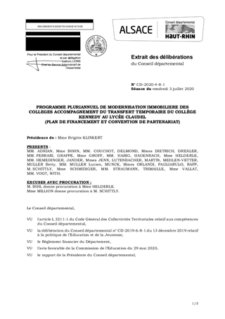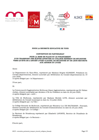 Le collège Kennedy va être relocalisé pendant la durée des travaux de rénovation sur le site de l'ancien lycée Claudel qui jouxte le collège Villon à Mulhouse. Pendant cette période, les demi-pensionnaires du collège Kennedy seront accueillis au sein de la restauration scolaire du collège Villon. Le présent rapport propose une convention de partenariat tripartite à ce sujet. La 8ème Commission réunie le 26 juin 2020 a donné un avis favorable au présent rapport.