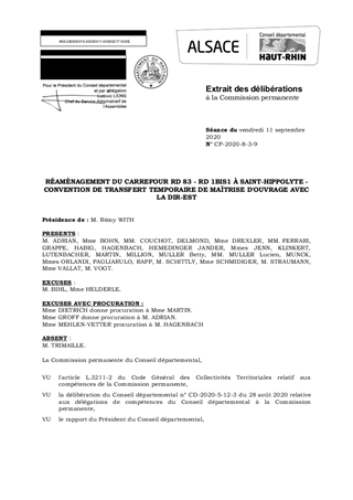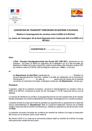 Le présent rapport a pour objet d'approuver les termes de la convention de transfert temporaire de la maîtrise d'ouvrage entre le Département et la Direction Interdépartementale des Routes EST dans le cadre des travaux de réaménagement du carrefour RD 83 - RD 1bis1 à SAINT-HIPPOLYTE.