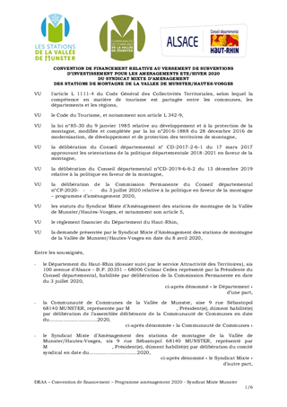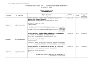 Dans le cadre du programme d'aménagement 2020 des Syndicats Mixtes de Montagne, il est proposé : - d'accorder un montant total de 750 000 €, réparti comme suit : o 250 000 € en faveur du Syndicat Mixte d’Aménagement des stations de montagne de la Vallée de Munster/Hautes-Vosges (SMVM), o 250 000 € en faveur du Syndicat Mixte pour l’Aménagement du Site du Lac Blanc (SMALB), o 250 000 € en faveur du Syndicat Mixte pour l’Aménagement du Massif du Markstein Grand-Ballon (SMMGB). - d’approuver les conventions y afférentes et d’autoriser la Présidente à les signer. Ce rapport a fait l'objet d'un avis favorable de la Commission Agriculture, Environnement et Cadre de Vie lors de sa réunion en date du 29 mai 2020.