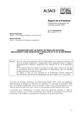Dans le cadre du partenariat entre le Département et le Powiat de Wroclaw, il vous est proposé d’approuver le déplacement d’une délégation d’élus et d’agents départementaux à Wroclaw, programmé pour l’instant du 27 au 30 septembre 2020. Outre l’organisation de la réunion annuelle du Comité mixte, instance de pilotage du partenariat entre les deux collectivités, le déplacement vise un échange d’expériences dans le domaine social. Ce rapport a reçu un avis favorable de la Commission Actions, Relations Internationales et Promotion du Bilinguisme lors de sa séance du 17 avril 2020.