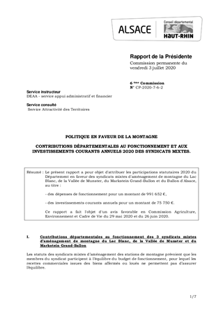 Le présent rapport a pour objet d'attribuer les participations statutaires 2020 du Département en faveur des syndicats mixtes d'aménagement de montagne du Lac Blanc, de la Vallée de Munster, du Markstein Grand-Ballon et du Ballon d'Alsace, au titre : - des dépenses de fonctionnement pour un montant de 991 652 €, - des investissements courants annuels pour un montant de 75 750 €. Ce rapport a fait l'objet d'un avis favorable en Commission Agriculture, Environnement et Cadre de Vie du 29 mai 2020 et du 26 juin 2020.