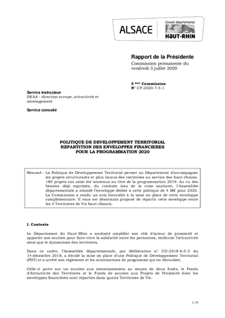 La Politique de Développement Territorial permet au Département d’accompagner les projets structurants et plus locaux des territoires au service des haut-rhinois. 180 projets ont ainsi été soutenus au titre de la programmation 2019. Au vu des besoins déjà exprimés, du contexte issu de la crise sanitaire, l’Assemblée départementale a abondé l’enveloppe dédiée à cette politique de 4 M€ pour 2020. La Commission a rendu un avis favorable à la mise en place de cette enveloppe complémentaire. Il vous est désormais proposé de répartir cette enveloppe entre les 4 Territoires de Vie haut-rhinois.