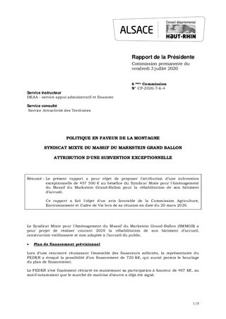 Le présent rapport a pour objet de proposer l’attribution d’une subvention exceptionnelle de 457 500 € au bénéfice du Syndicat Mixte pour l'Aménagement du Massif du Markstein Grand-Ballon pour la réhabilitation de son bâtiment d’accueil. Ce rapport a fait l'objet d'un avis favorable de la Commission Agriculture, Environnement et Cadre de Vie lors de sa réunion en date du 20 mars 2020.