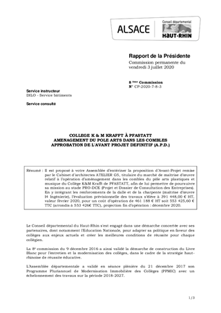 Il est proposé à votre Assemblée d’entériner la proposition d’Avant-Projet remise par le Cabinet d’architectes ATELIER G5, titulaire du marché de maîtrise d’œuvre relatif à l’opération d’aménagement dans les combles du pôle arts plastiques et musique du Collège K&M Krafft de PFASTATT, afin de lui permettre de poursuivre sa mission au stade PRO-DCE (Projet et Dossier de Consultation des Entreprises). En y intégrant les renforcements de la dalle et de la charpente (maîtrise d’œuvre I4 Ingénierie), l’évaluation prévisionnelle des travaux s’élève à 391 448,00 € HT, valeur février 2020, pour un coût d’opération de 461 188 € HT soit 553 425,60 € TTC (arrondis à 553 426€ TTC), projection fin d’opération : décembre 2020.
