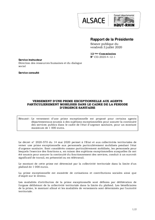 Le présent rapport a pour objet d’adopter le dispositif de financement de la « prime exceptionnelle CD68 COVID » à destination des professionnels des Etablissements et Services Sociaux et Médico-Sociaux (ESSMS) relevant du champ exclusif de compétence du Département du Haut-Rhin.