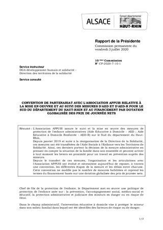 L'Association APPUIS assure le suivi et la mise en œuvre des mesures de protection de l'enfance administratives (Aide Educative à Domicile - AED ; Aide Educative à Domicile Renforcée - AED-R) sur le Sud du département du Haut-Rhin. Depuis janvier 2019 et suite à la réorganisation de la Direction de la Solidarité, ces mesures ont été transférées de l'Aide Sociale à l'Enfance vers les Territoires de Solidarité. Ainsi, ces derniers portent la décision de la mesure administrative en prenant en compte la situation de la famille dans son ensemble et peuvent activer à tout moment les leviers en proximité pour un travail en prévention auprès des mineurs. Depuis le transfert de ces mesures, l'organisation et les articulations avec l'Association APPUIS ont évolué et nécessitent aujourd'hui de reposer, à travers une convention, les différentes étapes de la mesure et les délais entre chacune. Cette convention ne modifie pas le nombre de mesures habilitées et reprend les termes du financement basés sur une dotation globalisée des prix de journée nets.