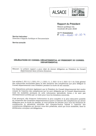 L'article L 3122-2 du Code Général des Collectivités Territoriales stipule qu'en cas de vacance du siège de Président pour quelque cause que ce soit, le Conseil départemental doit élire dans le mois son nouveau Président : tel est l'objet du présent rapport après la démission de Madame Brigitte KLINKERT, le 29 juillet 2020, de la présidence du Conseil départemental.