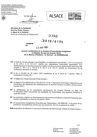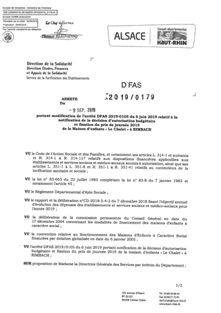 portant modification de l'arrêté DFAS 2019-0105 du 06.06.2019 relatif à la notification de la décision d'autorisation budgétaire et fixation du prix de journée 2019 de la maison d'enfants "Le Chalet" à RIMBACH