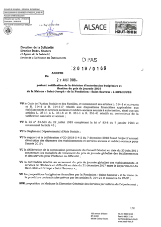 portant notification de la décision d'autorisation budgétaire et fixation du prix de journée 2019 de la maison "Saint Joseph" de la fondation "Saint Sauveur" à MULHOUSE