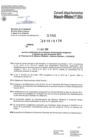 portant notification de la décision d'autorisation budgétaire et fixation du prix de journée 2019 de l'Internat de la maison d'enfants "Gustave Stricker" à ILLZACH