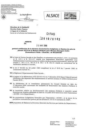 portant notification de la décision d'autorisation budgétaire et fixation du prix de journée 2019 de la maison d'enfants pour mineurs étrangers isolés demandeurs d'asile "Chemida" de MULHOUSE