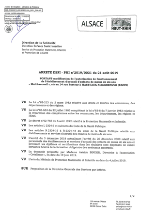 portant modification de l'autorisation de fonctionnement de l'établissement d'accueil d'enfants de moins de six ans "Multi-accueil", sis au 14 rue Pasteur à MASEVAUX-NIEDERBURCK (68290)