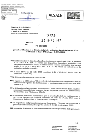 portant notification de la décision d'autorisation budgétaire et fixation du prix de journée 2019 du centre maternel de l'association "L'Ermitage" de MULHOUSE