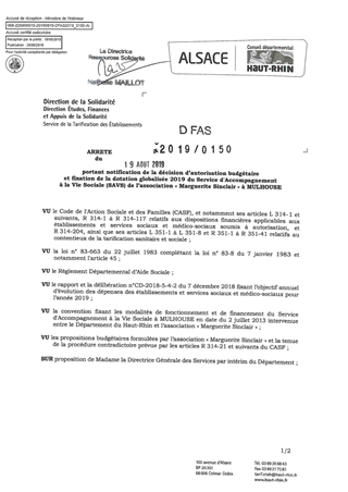 portant notification de la décision d'autorisation budgétaire et fixation de la dotation globalisée 2019 du service d'accompagnement à la vie sociale (SAVS) de l'association "Marguerite Sinclair" à MULHOUSE