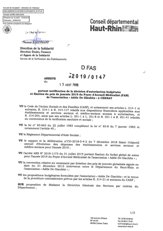 portant notification de la décision d'autorisation budgétaire et fixation du prix de journée 2019 du foyer d'accueil médicalisé (FAM) de l'association "Adèle de Glaubitz" à CERNAY