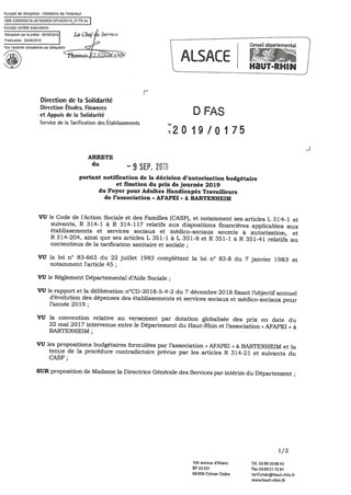 portant notification de la décision d'autorisation budgétaire et fixation du prix de journée 2019 du foyer pour adultes handicapés travailleurs de l'association "AFAPEI" à BARTENHEIM