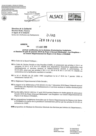 portant notification de la décision d'autorisation budgétaire et fixation du prix de journée 2019 du foyer d'accueil médicalisé "Les Peupliers" au centre départemental de repos et de soins à COLMAR