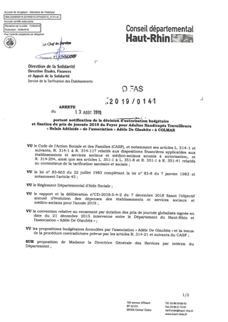 portant notification de la décision d'autorisation budgétaire et fixation du prix de journée 2019 du foyer pour adultes handicapés travailleurs "Relais Adélaïde" de l'association "Adèle de Glaubitz" à COLMAR