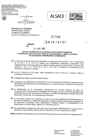 portant notification de la décision d'autorisation budgétaire et fixation du prix de journée 2019 du jardin d'enfants et du multi-accueil de la maison d'accueil de jour de l'association RESONANCE à LOGELBACH