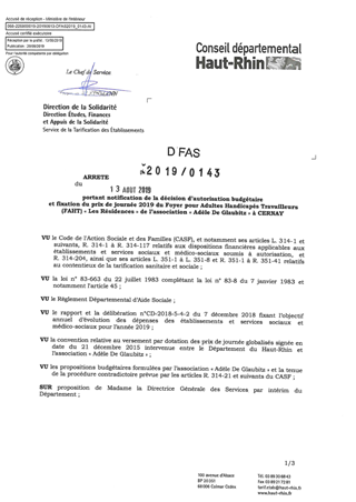 portant notification de la décision d'autorisation budgétaire et fixation du prix de journée 2019 du foyer pour adultes handicapés travailleurs (FAHT) "Kennedy" de l'association "Adèle de Glaubitz" à CERNAY