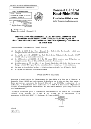 PARTICIPATION DÉPARTEMENTALE À LA FETE DE LA MANGUE 2015 ORGANISÉE PAR L'ASSOCIATION "AGRICULTEURS FRANÇAIS ET DÉVELOPPEMENT INTERNATIONAL" DU HAUT-RHIN (AFDI68) LE DIMANCHE 26 AVRIL 2015