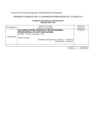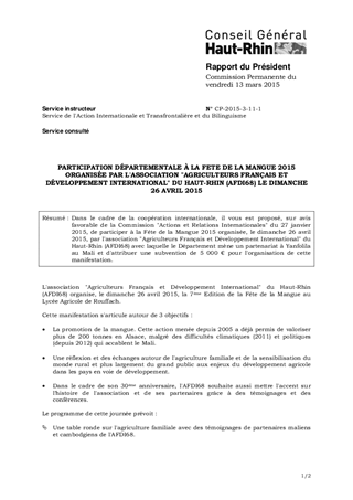 Dans le cadre de la coopération internationale, il vous est proposé, sur avis favorable de la Commission "Actions et Relations Internationales" du 27 janvier 2015, de participer à la Fête de la Mangue 2015 organisée, le dimanche 26 avril 2015, par l'association "Agriculteurs Français et Développement International" du Haut-Rhin (AFDI68) avec laquelle le Département mène un partenariat à Yanfolila au Mali et d'attribuer une subvention de 5 000 € pour l'organisation de cette manifestation.