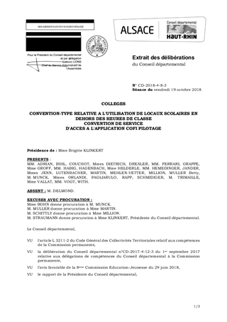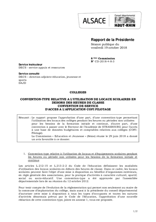 Le rapport propose l’approbation d’une part, d’une convention-type permettant l’utilisation des locaux des collèges pendant les heures ou périodes non utilisées pour les besoins de la formation initiale et continue, d’autre part, d’une convention à passer avec le Rectorat de l’Académie de STRASBOURG pour l’accès à une base de données budgétaires et comptables relatives aux collèges (COFI-Pilotage). La Commission « Education et Jeunesse » (8ème) réunie le 29 juin 2018 a donné un avis favorable à ce dossier.