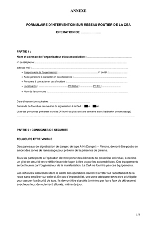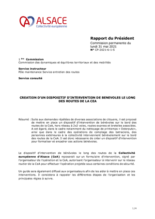 Suite aux demandes répétées de diverses associations de citoyens, il est proposé de mettre en place un dispositif d’intervention de bénévoles sur le bord des routes de la CeA, hors réseau à 2x2 voies, routes express et bretelles associées. A cet égard, dans le cadre notamment du nettoyage de printemps « Osterputz», ainsi que dans le cadre des opérations de comptage des batraciens, des personnes extérieures à la collectivité interviennent bénévolement sur le bord des routes de la CeA. Il est donc nécessaire de créer un dispositif d’intervention pour formaliser et encadrer ces actions bénévoles.