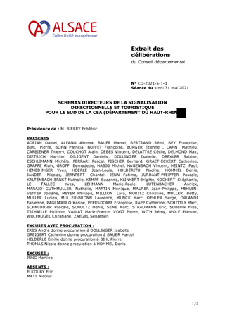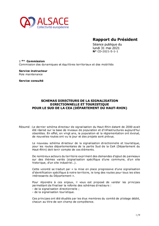 Le dernier schéma directeur de signalisation du Haut-Rhin datant de 2000 avait été réalisé sur la base de niveaux de population et d’infrastructures aujourd’hui obsolètes. En effet, en vingt ans, la population et la réglementation ont évolué, de nouvelles routes ont vu le jour et des projets sont prévus. Le nouveau schéma directeur de la signalisation directionnelle et touristique, pour les routes départementales de la partie Sud de la CeA (Département du Haut-Rhin) doit tenir compte de ces éléments. De nombreux acteurs du territoire expriment des demandes d’ajout de panneaux sur des thèmes variés (signalisation spécifique d’une commune, d’un site historique, d’un site industriel…). Cette volonté se traduit par « la mise en place progressive d’une signalisation d’identification spécifique à notre territoire, le long des routes pour tous les sites intéressants du Département ». Pour répondre à ces enjeux, il vous est proposé de valider les principes permettant de finaliser la refonte des schémas directeurs : - de la signalisation directionnelle ; - de la signalisation touristique. Ces principes ont été étudiés par les élus membres du comité de pilotage dédié, chacun au titre de son champ de compétence.