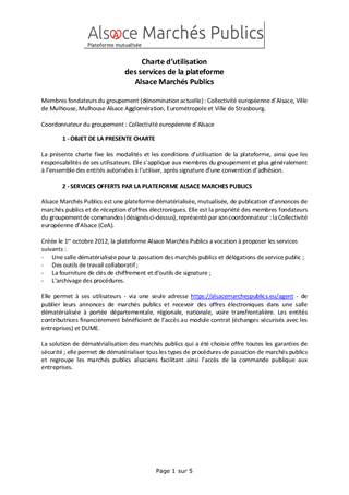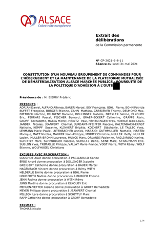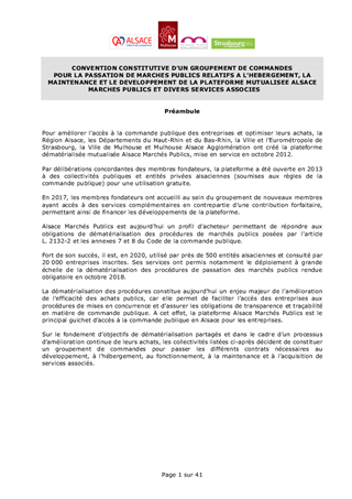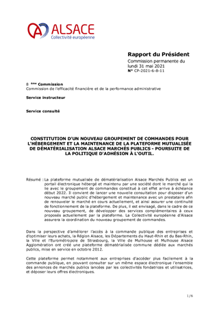 La plateforme mutualisée de dématérialisation Alsace Marchés Publics est un portail électronique hébergé et maintenu par une société dont le marché qui la lie avec le groupement de commandes constitué à cet effet arrive à échéance début 2022. Il convient de lancer une nouvelle consultation pour disposer d'un nouveau marché public d’hébergement et maintenance avec un prestataire afin de renouveler le marché en cours actuellement, et ainsi assurer une continuité de fonctionnement de la plateforme. De plus, il est envisagé, dans le cadre de ce nouveau groupement, de développer des services complémentaires à ceux proposés actuellement par la plateforme. La Collectivité européenne d’Alsace assurera la coordination du nouveau groupement de commandes.