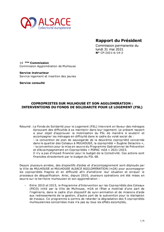 Le Fonds de Solidarité pour le Logement (FSL) intervient en faveur des ménages éprouvant des difficultés à se maintenir dans leur logement. Le présent rapport a pour objet d’approuver la mobilisation du FSL de manière à soutenir et accompagner les ménages en difficulté dans le cadre du volet social de : - la convention de plan de sauvegarde de la deuxième copropriété concernée dans le quartier des Coteaux à MULHOUSE, la copropriété « Eugène Delacroix », - la convention pour la mise en œuvre du Programme Opérationnel de Prévention et d'Accompagnement en Copropriétés « POPAC m2A » 2021-2023. Il n'y a pas d'impact financier pour le budget de la Collectivité. Ces actions sont financées directement par le budget du FSL 68.