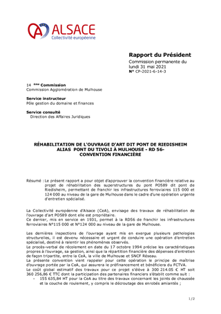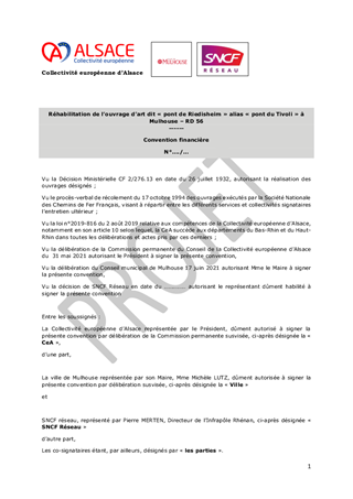 Le présent rapport a pour objet d’approuver la convention financière relative au projet de réhabilitation des superstructures du pont PO589 dit pont de Riedisheim, permettant de franchir les infrastructures ferroviaires 115 000 et 124 000 au niveau de la gare de Mulhouse dans le cadre d'une opération urgente d'entretien spécialisé.