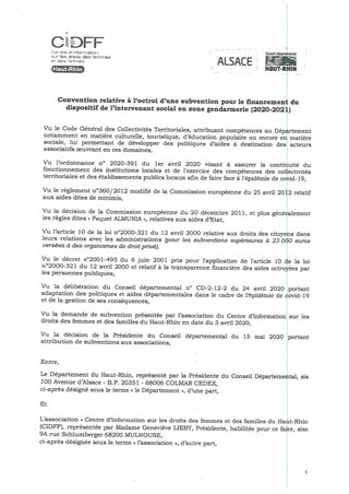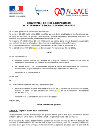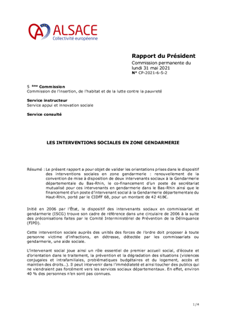 Le présent rapport a pour objet de valider les orientations prises dans le dispositif des interventions sociales en zone gendarmerie : renouvellement de la convention de mise à disposition de deux intervenants sociaux à la Gendarmerie départementale du Bas-Rhin, le co-financement d’un poste de secrétariat mutualisé pour ces intervenants en gendarmerie dans le Bas-Rhin ainsi que le financement d’un poste d’intervenant social à la Gendarmerie départementale du Haut-Rhin, porté par le CIDFF 68, pour un montant de 42 418€.