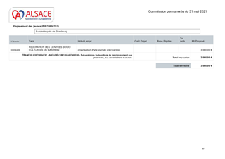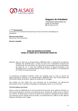 Dans le cadre de la programmation GERPLAN 2021, la Collectivité européenne d’Alsace est sollicitée pour la mise en œuvre de 4 opérations relevant des domaines de l’environnement, de l’agriculture, du paysage et de la sensibilisation au cadre de vie. Il vous est proposé de donner un accord favorable à ces demandes pour un montant total de 15 616 € (dont 10 866 € en investissement et 4 750 € en fonctionnement).