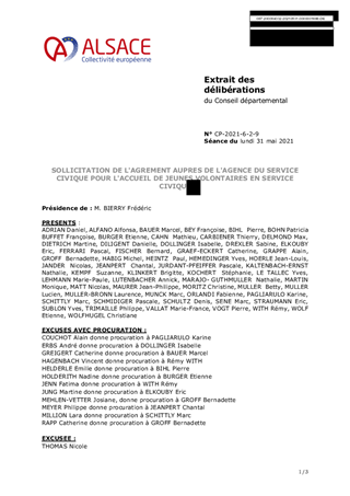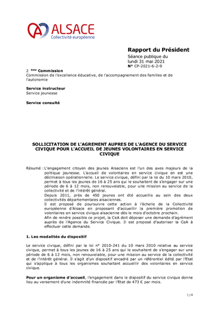 L’engagement citoyen des jeunes Alsaciens est l’un des axes majeurs de la politique jeunesse. L’accueil de volontaires en service civique en est une déclinaison opérationnelle. Le service civique, défini par la loi du 10 mars 2010, permet à tous les jeunes de 16 à 25 ans qui le souhaitent de s’engager sur une période de 6 à 12 mois, non renouvelable, pour une mission au service de la collectivité et de l’intérêt général. Depuis 2011, près de 450 jeunes ont été accueillis au sein des deux collectivités départementales alsaciennes. Il est proposé de poursuivre cette action à l’échelle de la Collectivité européenne d’Alsace en proposant d’accueillir la première promotion de volontaires en service civique alsacienne dès le mois d’octobre prochain. Afin de rendre possible ce projet, la CeA doit déposer une demande d’agrément auprès de l’Agence du Service Civique. Il est proposé d’autoriser la CeA à effectuer cette demande.