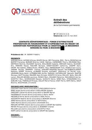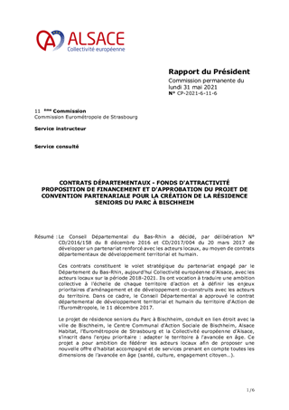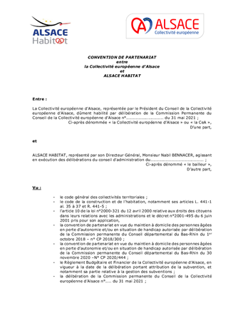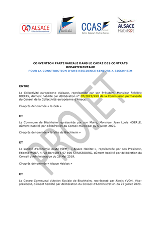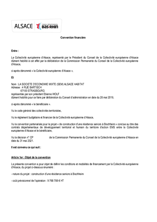 Le Conseil Départemental du Bas-Rhin a décidé, par délibération N° CD/2016/158 du 8 décembre 2016 et CD/2017/004 du 20 mars 2017 de développer un partenariat renforcé avec les acteurs locaux, au moyen de contrats départementaux de développement territorial et humain. Ces contrats constituent le volet stratégique du partenariat engagé par le Département du Bas-Rhin, aujourd’hui Collectivité européenne d’Alsace, avec les acteurs locaux sur la période 2018-2021. Ils ont vocation à traduire une ambition collective à l'échelle de chaque territoire d'action et à définir les enjeux prioritaires d'aménagement et de développement co-construits avec les acteurs du territoire. Dans ce cadre, le Conseil Départemental a approuvé le contrat départemental de développement territorial et humain du territoire d'Action de l’Eurométropole, le 11 décembre 2017. Le projet de résidence seniors du Parc à Bischheim, conduit en lien étroit avec la ville de Bischheim, le Centre Communal d'Action Sociale de Bischheim, Alsace Habitat, l’Eurométropole de Strasbourg et la Collectivité européenne d’Alsace, s'inscrit dans l'enjeu prioritaire : adapter le territoire à l'avancée en âge. Ce projet a pour ambition de fédérer les acteurs locaux afin de proposer une nouvelle offre d'habitat accompagné et de services prenant en compte toutes les dimensions de l’avancée en âge (santé, culture, engagement citoyen…). Il est proposé à la Commission permanente du Conseil de la Collectivité européenne d’Alsace d’attribuer une subvention de 606 815 euros à Alsace Habitat pour contribuer à l’acquisition du bien immobilier pour la création de la résidence seniors du Parc à Bischheim, par le biais d’une Vente en l’Etat Futur d’Achèvement (VEFA), conformément aux critères adoptés par délibération n° CD/2020/057 du 30 novembre 2020 du Conseil Départemental du Bas-Rhin. De plus, il est proposé d’approuver les termes de la convention de partenariat à conclure entre le bailleur social, la Ville de Bischheim, le Centre Communal Action Sociale de Bischheim et la Collectivité européenne d’Alsace et de la convention financière à conclure entre Alsace Habitat et la Collectivité européenne d’Alsace pour permettre le versement de la subvention correspondante.