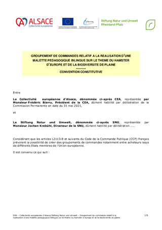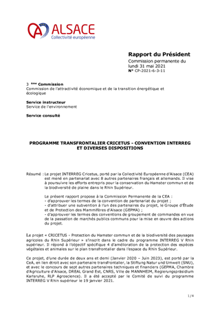 Le projet INTERREG Cricetus, porté par la Collectivité Européenne d’Alsace (CEA) est mené en partenariat avec 8 autres partenaires français et allemands. Il vise à poursuivre les efforts entrepris pour la conservation du Hamster commun et de la biodiversité de plaine dans le Rhin Supérieur. Le présent rapport propose à la Commission Permanente de la CEA : - d’approuver les termes de la convention de partenariat du projet ; - d’attribuer une subvention à l’un des partenaires du projet, le Groupe d’Étude et de Protection des Mammifères d’Alsace (GEPMA) ; - d’approuver les termes des conventions de groupement de commandes en vue de la passation de marchés publics communs pour la mise en œuvre des actions du projet.