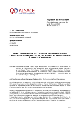 Le présent rapport a pour objet de proposer à la Commission Permanente de décider de l’attribution d'une subvention suite à la demande d’aide financière présentée par Alsace Habitat pour l’adaptation de 30 logements, tous situés sur le territoire de l’Eurométropole de Strasbourg (EMS) dans le cadre du Nouveau Programme Nationale du Renouvellement Urbain (NPNRU) - immeuble situé au 2 rue Victor Hugo à Schiltigheim.
