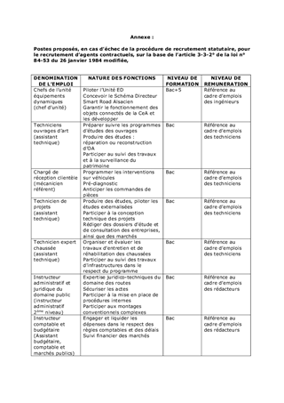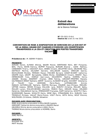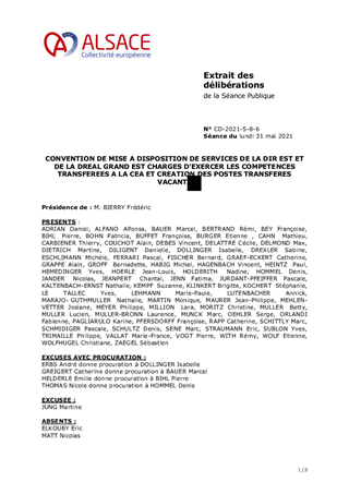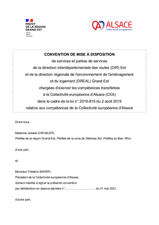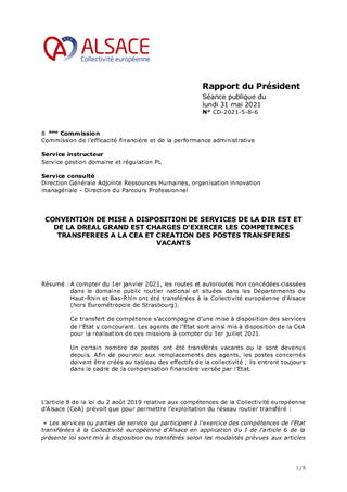 A compter du 1er janvier 2021, les routes et autoroutes non concédées classées dans le domaine public routier national et situées dans les Départements du Haut-Rhin et Bas-Rhin ont été transférées à la Collectivité européenne d'Alsace (hors Eurométropole de Strasbourg). Ce transfert de compétence s’accompagne d’une mise à disposition des services de l’Etat y concourant. Les agents de l’Etat sont ainsi mis à disposition de la CeA pour la réalisation de ces missions à compter du 1er juillet 2021. Un certain nombre de postes ont été transférés vacants ou le sont devenus depuis. Afin de pourvoir aux remplacements des agents, les postes concernés doivent être créés au tableau des effectifs de la collectivité ; ils entrent toujours dans le cadre de la compensation financière versée par l’Etat.