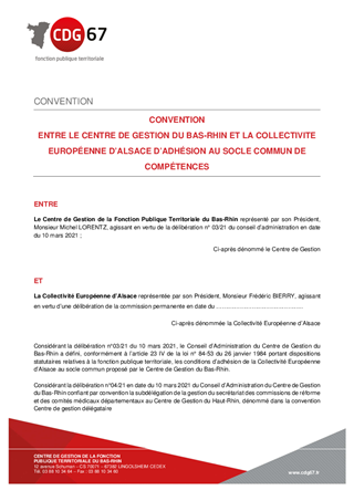 Eu égard à l’échéance le 31 décembre dernier des conventions qui liaient chacun des deux Départements alsaciens à son centre de gestion de rattachement pour le secrétariat du Comité Médical et de la Commission de Réforme, il vous est proposé de conclure une nouvelle convention au nom de la Collectivité européenne d’Alsace pour une durée de six années.