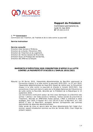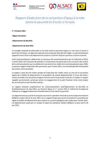 Le 04 février 2019, l’Assemblée départementale du Bas-Rhin approuvait la Convention d’appui à la lutte contre la pauvreté 2019-2021. Le 21 juin 2019, l’Assemblée départementale du Haut-Rhin faisait de même pour la Convention d’appui à la lutte contre la pauvreté et d’accès à l’emploi 2019-2021. Ces conventions s’inscrivent dans le cadre de la Stratégie Nationale de Prévention et de Lutte contre la Pauvreté, dévoilée par le Président de la République le 13 septembre 2018. Les Conventions s’articulent autour de trois axes identiques (la prévention des sorties « sèches » de l’aide sociale à l’enfance, l’action sociale de proximité et l’insertion), déclinés en différentes fiches actions. L’Etat a contribué à cette stratégie, pour 2020, à hauteur de 2 231 197,47 € pour le Bas-Rhin, et 1 162 693,62 € pour le Haut-Rhin, auxquels doivent correspondre des sommes équivalentes de dépenses départementales. Cette année de mise en œuvre dans les deux départements fait l’objet d’un premier rapport d’exécution commun au titre de l’année 2020. C’est l’objet du présent rapport.