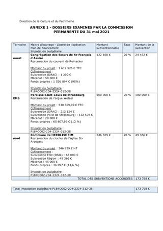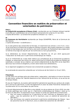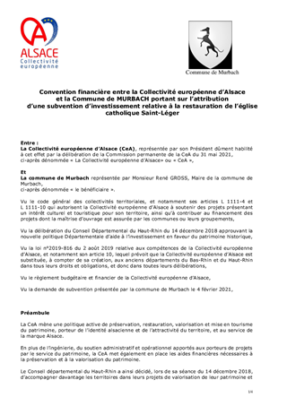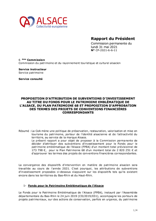 La CeA mène une politique de préservation, restauration, valorisation et mise en tourisme du patrimoine, porteur de l'identité alsacienne et de l'attractivité du territoire, au service de la marque Alsace. Le présent rapport a pour objet de proposer à la Commission permanente de décider d'attribuer des subventions d'investissement pour le Fonds pour le patrimoine emblématique de l'Alsace (FPEA) d'un montant total prévisionnel de 173 798 €, pour le Plan Patrimoine 68 d'un montant total de 2 820 251 € et d'approuver les termes des projets de conventions financières correspondantes.