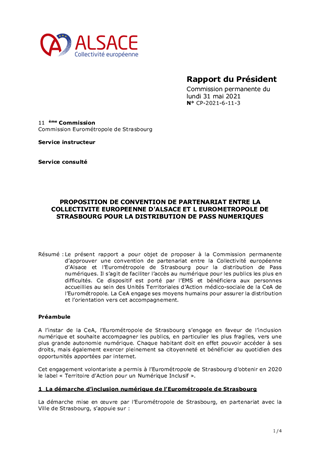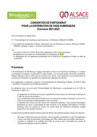 Le présent rapport a pour objet de proposer à la Commission permanente d’approuver une convention de partenariat entre la Collectivité européenne d’Alsace et l’Eurométropole de Strasbourg pour la distribution de Pass numériques. Il s’agit de faciliter l’accès au numérique pour les publics les plus en difficultés. Ce dispositif est porté par l’EMS et bénéficiera aux personnes accueillies au sein des Unités Territoriales d’Action médico-sociale de la CeA de l’Eurométropole. La CeA engage ses moyens humains pour assurer la distribution et l’orientation vers cet accompagnement.