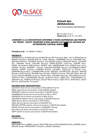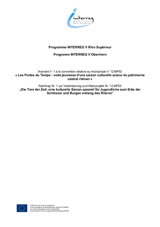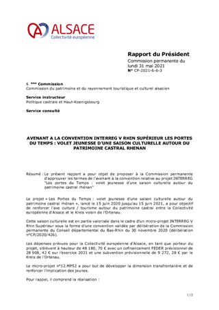 Le présent rapport a pour objet de proposer à la Commission permanente d'approuver les termes de l'avenant à la convention relative au projet INTERREG "Les portes du Temps : volet jeunesse d'une saison culturelle autour du patrimoine castral rhénan"
