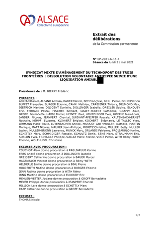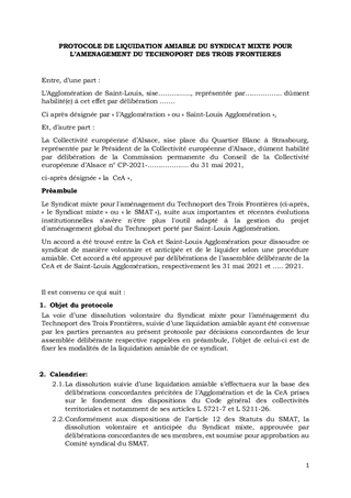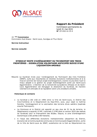 Le Syndicat mixte pour l'aménagement du Technoport des trois frontières (SMAT), suite aux importantes et récentes évolutions institutionnelles et à la mise en sommeil de l'actuel projet d'aménagement, s'avère ne plus être l'outil le mieux adapté à la gestion du projet d'aménagement porté par Saint-Louis Agglomération. L'intention de la Collectivité européenne d'Alsace et de Saint-Louis Agglomération est d'engager la dissolution du Syndicat, de manière volontaire et anticipée et sa liquidation selon une procédure amiable.