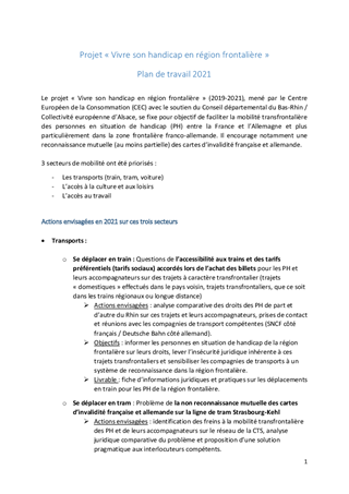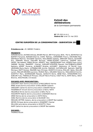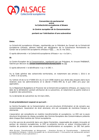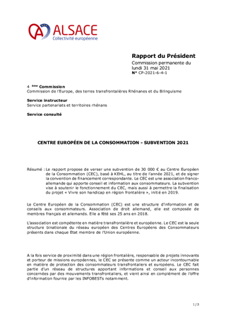 Le rapport propose de verser une subvention de 30 000 € au Centre Européen de la Consommation (CEC), basé à KEHL, au titre de l’année 2021, et de signer la convention de financement correspondante. Le CEC est une association franco-allemande qui apporte conseil et information aux consommateurs. La subvention vise à soutenir le fonctionnement du CEC, mais aussi à permettre la finalisation du projet « Vivre son handicap en région frontalière », initié en 2019.