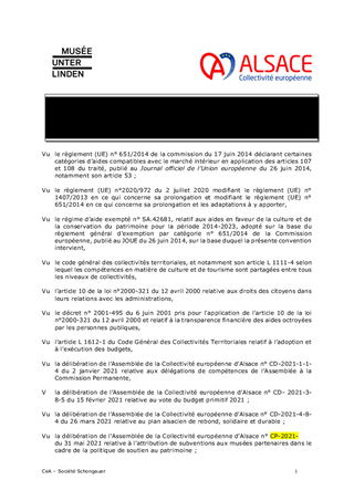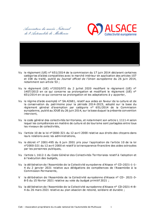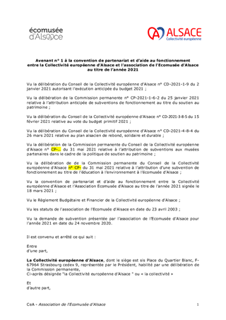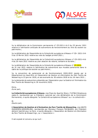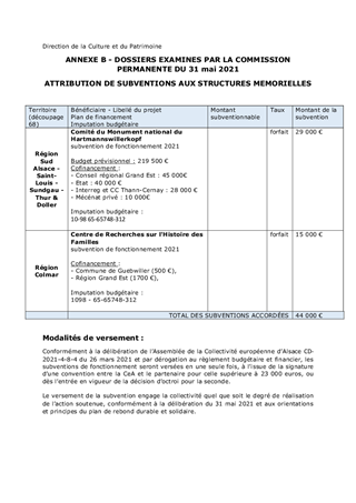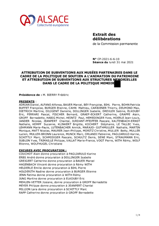Au titre des politiques en faveur du patrimoine et de la mémoire, la Collectivité européenne d’Alsace soutient en fonctionnement l’animation du patrimoine et de la mémoire ainsi que l'investissement des musées partenaires. Il vous est proposé d’attribuer et d’autoriser le versement de subventions de fonctionnement en faveur de 6 musées et de 2 structures mémorielles pour un montant total de 661 405 € réparti de la manière suivante : - 246 000 € pour l’Association pour la Gestion et l'Animation du Parc Textile de Wesserling, - 240 000 € pour l’Association de l’Ecomusée d’Alsace à Ungersheim, - 7 000 € pour l'Association Groupe Rodolphe, concernant le carreau Rodolphe à Pulversheim, - 9 405 € pour le Musée du sapeur-pompier d'Alsace à Vieux-Ferrette, - 75 000 € pour l'Association Propriétaire du Musée National de l'Automobile de Mulhouse concernant la Cité de l'Automobile, - 40 000 € pour la société Schongauer concernant le Musée Unterlinden à Colmar, - 29 000 € pour le Comité du Monument national du Hartmannswillerkopf, - 15 000 € pour le Centre de Recherches sur l'Histoire des Familles (CRHF). Il vous est également proposé d’attribuer et d'autoriser le versement de subventions d'investissement en faveur de 2 musées pour un montant total de 350 000 € réparti de la manière suivante : - 100 000 € pour l’Association de Gestion et d’Animation du Parc Textile de Wesserling, - 250 000 € pour l’Association de l’Ecomusée d’Alsace à Ungersheim.