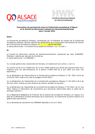 L’agriculture représente un enjeu majeur pour l’économie alsacienne, mais également pour l’aménagement et le dynamisme du territoire. Elle produit nos aliments, entretient nos paysages, crée de l’emploi et contribue à la vitalité de nos territoires ruraux. Les enjeux d’un partenariat entre la Collectivité européenne d’Alsace et la profession agricole sont donc nombreux et variés. Les Départements du Bas-Rhin et du Haut-Rhin avaient d’ailleurs de longue date soutenus des actions portées par la Chambre d’Agriculture Alsace, La politique agricole de la Collectivité européenne d’Alsace, menée en étroit partenariat avec la Chambre d’Agriculture Alsace, vise à promouvoir une agriculture alsacienne compétitive, durable, génératrice d’emploi et de richesses. La présente convention décline les modalités de versement par la Collectivité européenne d’Alsace, d’une aide financière de 840 000 € à la Chambre d’Agriculture Alsace pour l'année 2021.