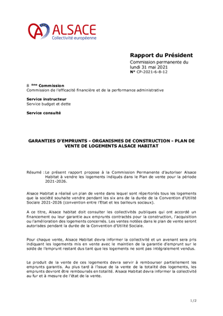 Le présent rapport propose à la Commission Permanente d’autoriser Alsace Habitat à vendre les logements indiqués dans le Plan de vente pour la période 2021-2026.